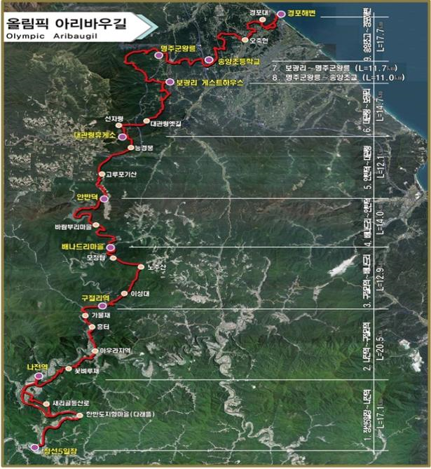 '올림픽 아리바우길' 동선에는 △1966년 2월17일에 처음 열린 전국 최대 규모의 민속장 '정선 5일장' △무인역으로 운영 중인 '나전역' △레일바이크 구간으로 운행 중인 '아우라지역' △레일바이크를 타고 아우라지역으로 되돌아가는 코스인 '구절리역' △노나라 공자와 추나라 맹자를 기리는 산인 '노추산' △돌탑골 3000개가 있는 '모정탑길' △국내 최대 고랭지 채소단지로 치유의 명소로 알려진 '안반덕' △오죽헌 등 평창, 강릉, 정선의 주요 관광지 등이 있다.오는 2017년 6월 준공 예정인 '올림픽 아라바우길' 세부 노선도. <사진제공=문화체육관광부>