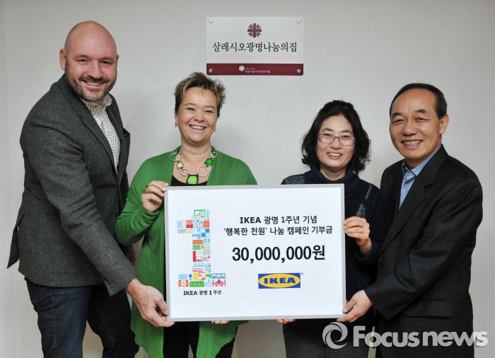 (서울=포커스뉴스) 홈퍼니싱 기업 이케아 코리아는 광명점 1주년 기념 ‘행복한 천원’ 나눔 캠페인을 통해 모은 기부금 3000만원을 광명시 아동복지시설 ‘살레시오광명나눔의집’에 27일 전달했다.