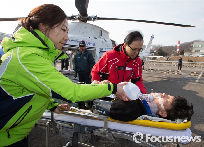 (천안=포커스뉴스) 27일 오후 충남 천안시 단국대학교병원에서 열린 충청남도 응급의료 전용헬기(닥터헬기) 출범식에서 의료진들이 가상 환자이송훈련을 하고 있다.