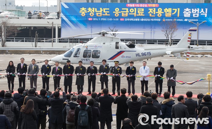 (천안=포커스뉴스) 27일 오후 충남 천안시 단국대학교병원에서 열린 충청남도 응급의료 전용헬기(닥터헬기) 출범식에서 내빈들이 테이프커팅식을 하고 있다.