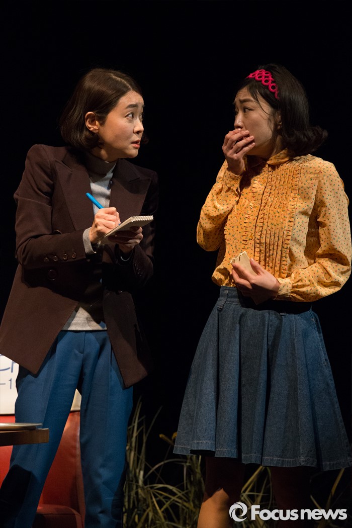 (서울=포커스뉴스) 27일 오전 서울 중구 명동예술극장에서 열린 연극 '날 보러와요' 프레스콜에 배우 이항나(박기자)와 공상아(미스김)이 연기하고 있다.