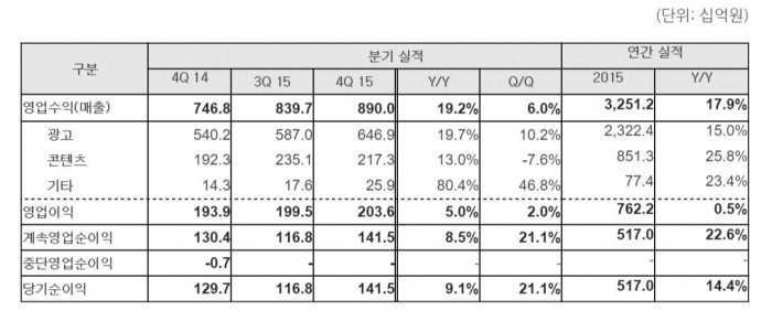 네이버는 연결기준 2015년 연간 매출이 3조2511억원, 영업이익 7622억원을 기록했다고 28일 공시했다. 이는 전년 대비 각각 17.9%, 0.5%씩 증가한 수치다. 순이익은 14.4% 증가한 5169억원으로 집계됐다.