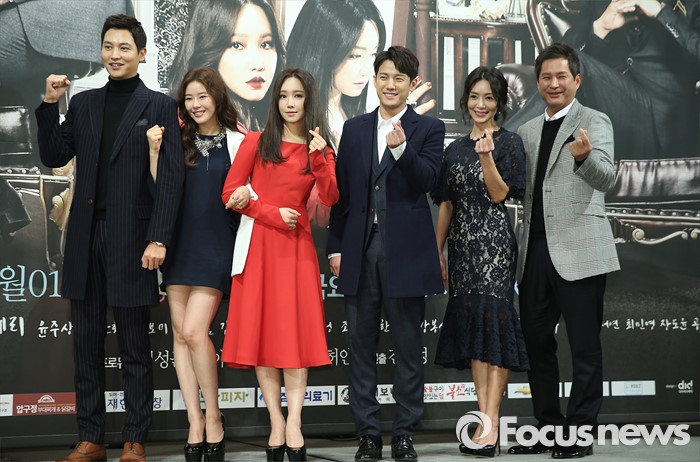 (서울=포커스뉴스) 28일 오후 서울 강남구 임피리얼 팰리스 호텔에서 열린 KBS 2TV 저녁 일일드라마 ' 천상의 약속' 제작발표회에 참석한 배우 송종호(왼쪽부터), 박하나, 이유리, 서준영, 김혜리, 이종원이 포토타임을 갖고 있다.
