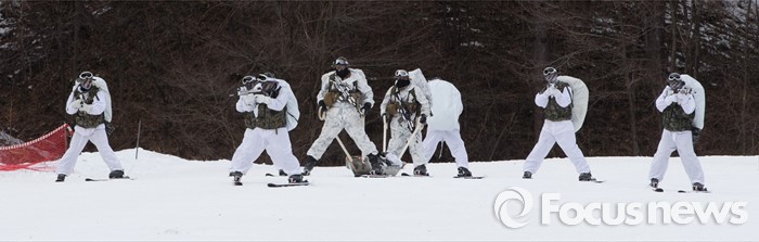 (평창=포커스뉴스) 28일 강원도 평창군 황병산 해병대 산악 종합훈련장에서 열린 '한·미 해병대 연합 동계 설한지 훈련'에 해병대 수색대대와 미 해병대 3사단 수색중대 장병들이 참가하고 있다.
