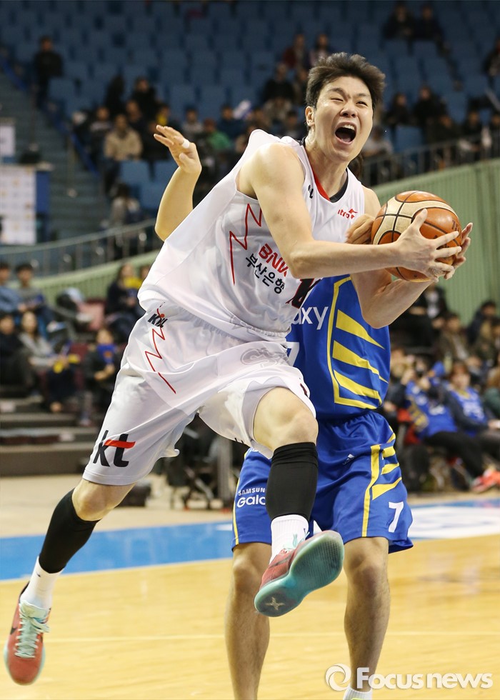 (서울=포커스뉴스) 28일 서울 잠실실내체육관에서 열린 2015-2016 프로농구 삼성-KT 경기에서 KT 조성민이 삼성 박재현의 저지를 뚫고 레이업슛을 시도하고 있다.