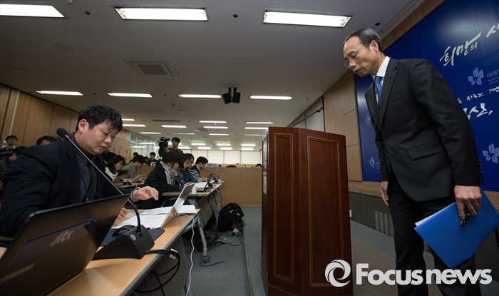 (과천=포커스뉴스) 29일 오후 경기 정부과천청사 미래창조과학부에서 조규조 통신정책국 국장이 제4이동통신 심사 결과 발표를 마치고 인사하고 있다.