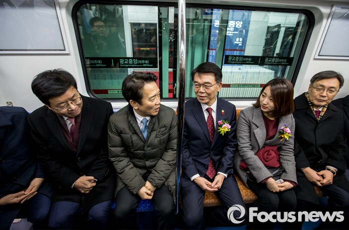 (수원=포커스뉴스) 강호인(왼쪽 세 번째) 국토교통부 장관과 남경필(왼쪽 두 번째) 경기도지사를 비롯한 주요내빈들이 29일 오후 경기도 수원시 영통구 신분당선 광교중앙역에서 열린 '정자-광교 복선전철 개통행사'를 마친 뒤 시승하고 있다.