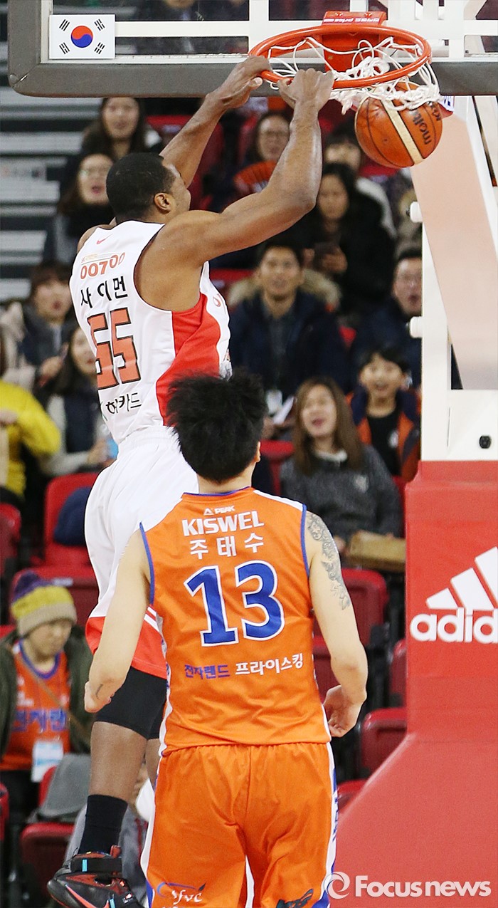 (인천=포커스뉴스) 29일 인천 삼산체육관에서 열린 2015-2016 프로농구 전자랜드-SK 경기에서 SK 사이먼이 투핸드 덩크를 넣고 있다.