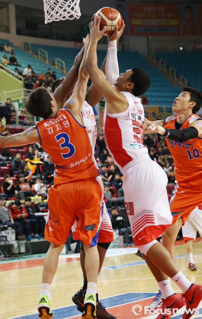 (인천=포커스뉴스) 29일 인천 삼산체육관에서 열린 2015-2016 프로농구 전자랜드-SK 경기에서 SK 사이먼, 박승리와 전자랜드 김지완이 치열한 리바운드 다툼을 벌이고 있다.
