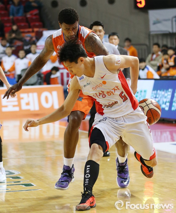 (인천=포커스뉴스) 29일 인천 삼산체육관에서 열린 2015-2016 프로농구 전자랜드-SK 경기에서 전자랜드 포웰이 SK 김선형의 볼을 뒤에서 가로채고 있다.