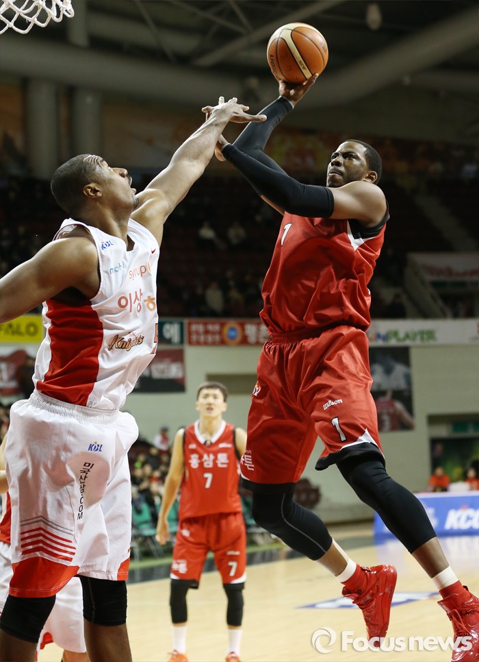(안양=포커스뉴스) 31일 안양실내체육관에서 열린 2015-2016 프로농구 KGC-SK 경기에서 KGC 찰스 로드가 SK 사이먼의 마크를 받으며 원핸드슛을 시도하고 있다.