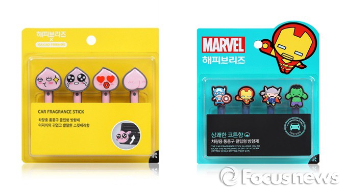 카카오톡 향기스틱은 카카오톡 캐릭터 네오, 프로도, 튜브, 어피치의 얼굴 표정이 담긴 스틱형 방향제로 △오렌지 블로썸 △코튼 △블루스카이 △스윗베리 네 가지 향이 출시됐다. 스파이더맨, 헐크, 토르, 아이언맨 등의 캐릭터가 디자인된 마블 향기스틱은 코튼과 스윗프루티 향 두 가지를 선보인다. 가격은 각 1만2900원이다.