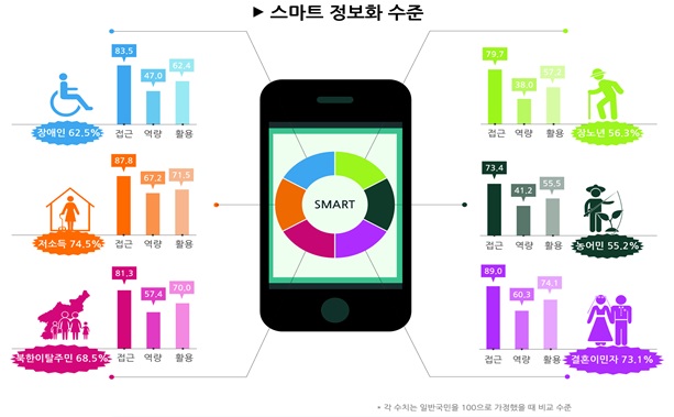 유선․모바일을 통합한 스마트정보화수준은 일반국민의 59.7%로, 접근(80.8%)은 일반국민과의 격차가 19.2%로 그 차이가 상대적으로 작았으나, 기본 이용수준(44.0%) 및 활용(60.0%)은 일반국민과의 격차가 각각 56.0%, 40.0%로 그 차이가 크게 조사됐다.