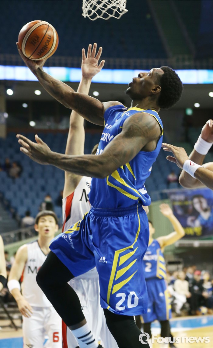 삼성은 라틀리프가 31득점 11리바운드로 골밑을 지배했다. 반면 모비스는 송창용이 13득점으로 팀내 최다득점자가 될 정도로 득점력이 현저히 떨어졌다. 이날 모비스가 기록한 49득점은 지난해 10월17일 전자랜드 상대로 기록한 50득점보다 1점 적은 팀 역대 1경기 최소득점이다.(서울=포커스뉴스) 2일 서울 잠실실내체육관에서 열린 2015-2016 프로농구 삼성-모비스 경기에서 삼성 라틀리프가 리버스 레이업슛을 시도하고 있다. 2016.02.02 우정식 기자