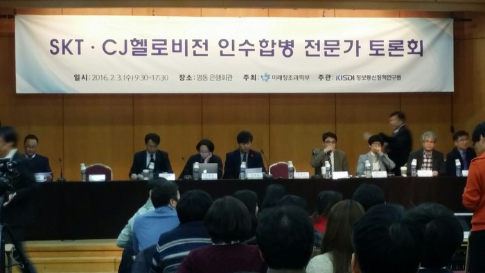 김경만 미래부 과장은 “SK텔레콤의 CJ헬로비전 인수합병의 산업 경제적 파급 효과, 시청자에게 미치는 영향 등 주요 쟁점에 대한 전문가 의견 청취를 통해 심사하겠다”고 밝혔다.SK텔레콤의 CJ헬로비전 인수합병 전문가 토론회에서 토론자들이 이야기를 하고 있다. 2016.02.03 왕해나 기자 e2@focus.co.kr