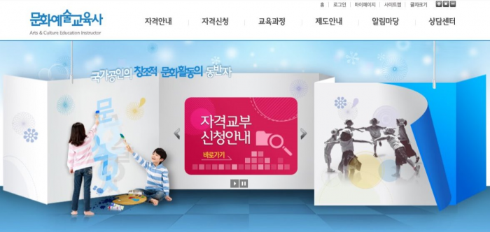 문화예술교육사 교육기관은 문화예술교육사 자격 취득을 희망하는 사람이 자격 취득에 필요한 교육과정을 이수할 수 있도록 교육과정과 교육내용, 교육인력, 시설·장비 등 일정 기준을 충족해야 하며 '문화예술교육 지원법' 제28조에 따라 문화체육관광부 장관이 지정한다.문화예술교육사 홈페이지 화면.<사진출처=문화예술교육사>