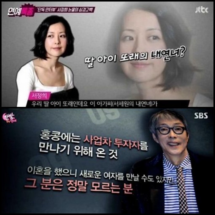 한편 서세원의 전 부인인 서정희는 2014년 한 인터뷰에서 “서세원에게 내연녀가 있다”고 주장한 바 있다. 서정희와 서세원은 지난해 8월21일 합의 이혼했다.방송인 서세원이 한 주택에서 지난해 9월 내연녀 논란에 휩싸인 바 있는 여성과 함께 있는 모습이 한 매체에 의해 포착됐다.사진은 서정희와 서세원 방송 모습.<사진출처=서정희-JTBC '연예특종' 방송캡처/서세원-SBS '한밤의 TV연예' 방송캡처>