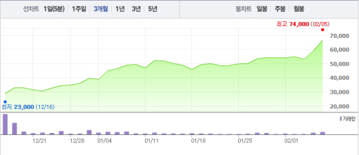 5일 오전 11시05분 현재 뉴트리바이오텍은 전날보다 7200원(12.20%) 오른 6만6200원에 거래되고 있다.