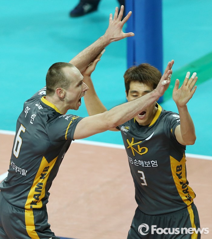 KB손해보험 마틴이 18득점, 김요한이 17득점, 손현종이 13득점을 각각 기록하며 대한항공 모로즈(28득점)와 김학민(20득점)을 넘고 승리를 일궈냈다.(서울=포커스뉴스) 24일 장충체육관에서 열린 '2015-2016NH농협 V-리그' 남자부 우리카드-KB손해보험 경기에서 KB손보 마틴과 권영민이 블로킹 득점을 한뒤 환호하고 있다. 2015.11.24 우정식 기자