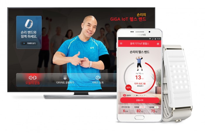 기가 IoT 헬스밴드는 헬스밴드+올레tv+스마트폰 연동을 통해 정확한 운동 자세와 정보(칼로리, 식단 등) 확인이 가능한 서비스다.