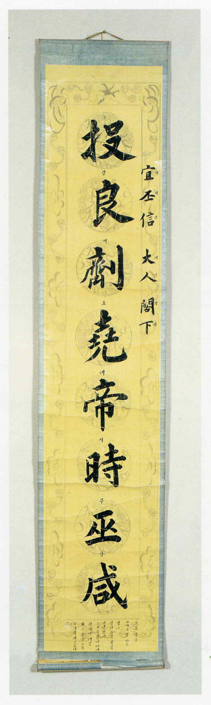 또한 족자의 아랫부분에도 가운데 글귀(投良濟堯帝時巫咸)의 뜻을 9행에 걸쳐 한글로 작게 풀어 놓았는데 이는 한자에 익숙하지 않은 서양인을 배려해 적은 것으로 보인다. 마지막 10행에는 가운데가 태극문양이고 그 외부를 괘(卦)와 글씨가 둘러싸고 있는 작은 인장이 찍혀 있다.