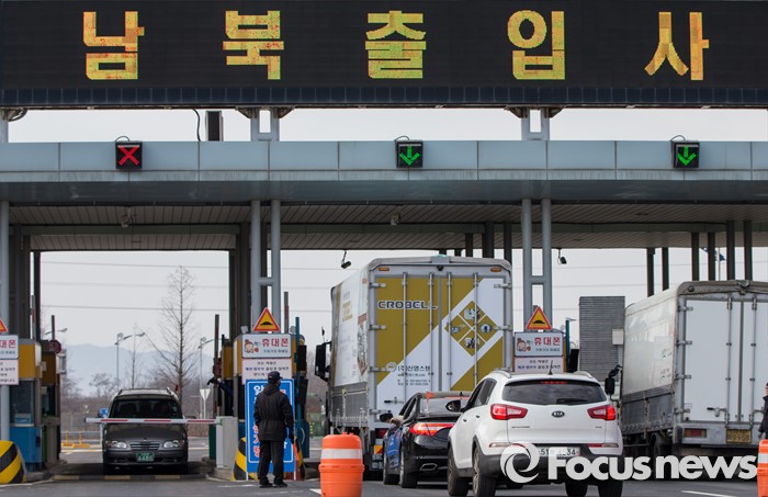 한편 정부는 이날 오후 2시 개성공단 정부합동대책반 회의를 열고 실무적인 대책을 마련한다. 또한 이날 오전 10시부터는 개성공업지구지원재단 내에 '개성공단 기업 종합지원센터'를 설치, 운영을 시작했다.(파주=포커스뉴스) 11일 오전 경기 파주시 경의선 남북출입사무소에서 개성공단 화물차들이 출경 및 입경하고 있다. 2016.02.11 양지웅 기자