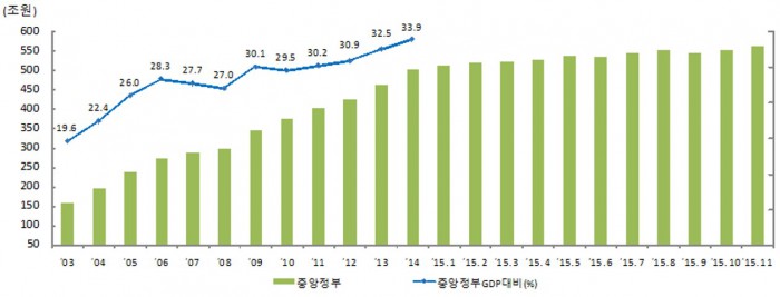 2015년 연간 국세수입은 217조9000억원으로 전년 대비 12조4000억원 증가했다. 세목별로 소득세는 부동산거래량 및 취업자 수 증가로 7조4000억원 늘었고 법인세는 법인 신고실적 개선 및 비과세, 감면 정비 등으로 2조4000억원 증가했다.중앙정부채무추이 <자료출처=기획재정부>