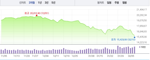 11일 건국기념일로 휴장한 이후 니케이225 지수는 개장 15분 만에 1만5000선이 무너지면서 급격히 하락했다. 이후 1만5000선을 회복하기도 했지만 장 마감 전 급락하면서 1만5000선 아래로 밀렸다.