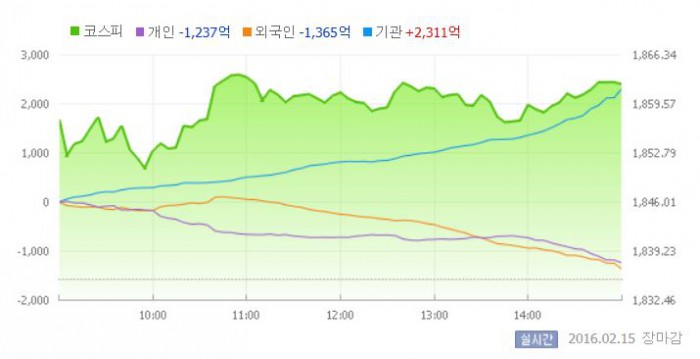 15일 코스피지수는 전거래일 대비 1.47%(26.92포인트) 오른 1862.20에 장을 마쳤다. 코스닥지수는 전거래일 보다 2.12%(12.92포인트) 상승한 621.37에 마감했다.