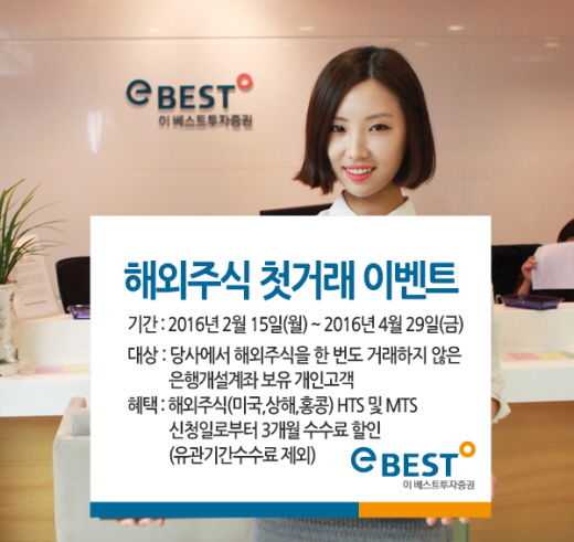 (서울=포커스뉴스) 이베스트투자증권은 4월 29일까지 해외주식 첫거래 이벤트를 진행한다고 16일 밝혔다.