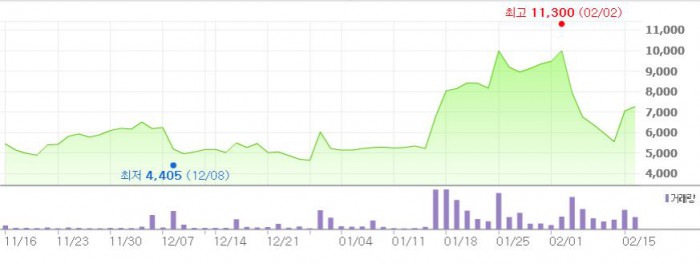 최규선 썬코어 회장은 "내달 제3회 국제전기자동차엑스포에서 K9모델 전기버스를 함께 선보이고, 제주 뿐만 아니라 부산·경기 등에서도 K9 전기버스를 활용할 계획"이라고 전했다.최근 3개월간 썬코어 주가 추이 <그래픽출처=네이버>