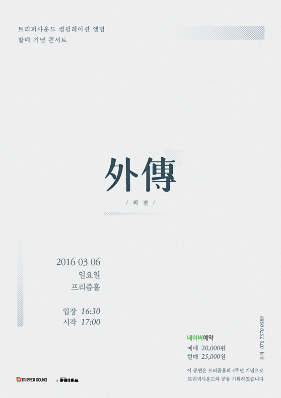 트리퍼사운드 컴필레이션 앨범 '외전(外傳)'은 16일 각종 음원사이트에서 공개됐다. 오는 18일 발매되며 다음달 6일 서울 합정 프리즘홀에서 앨범 발매 기념 콘서트를 연다.인디밴드 제8극장, 폰부스, 보이즈 인 더 키친이 레이블 트리퍼사운드 컴필레이션 앨범 '외전(外傳)'을 발매했다. 사진은 발매 기념 콘서트 포스터. <사진제공=트리퍼사운드>