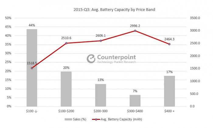 다만 일체형 배터리 용량의 한계를 어떻게 극복할 것인가에 대한 문제는 남아있다. 카운터포인트의 지난해 3분기 조사에서는 100!400달러대 휴대폰의 평균 배터리 용량은 2500~3000mAh대인데 반해 400달러 이상 프리미엄 폰 용량은 평균 2400mAh대로 다소 낮았다.