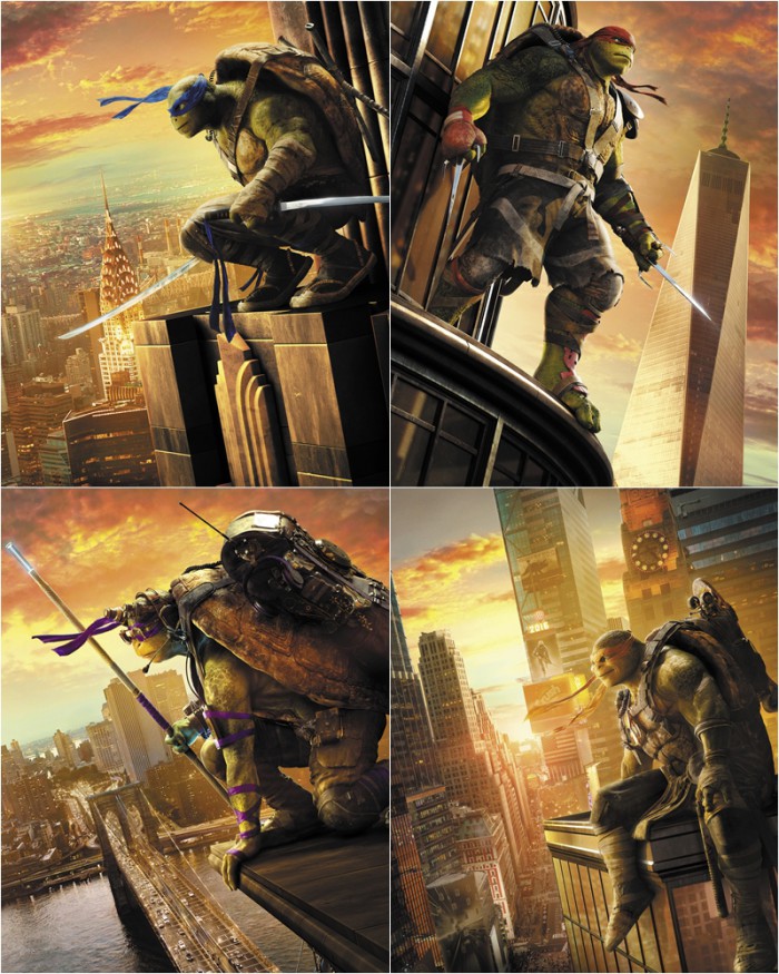 영화 '닌자터틀: 어둠의 히어로' 캐릭터 포스터에는 주인공 레오나르도, 라파엘, 도나텔로, 미켈란젤로가 각각 미국 뉴욕의 주요 랜드마크인 크라이슬러 빌딩, 원월드트레이드센터, 브루클린 브릿지, 타임스퀘어에 꼭대기에 서서 도시를 내려다보는 모습이 담겨 있다.
