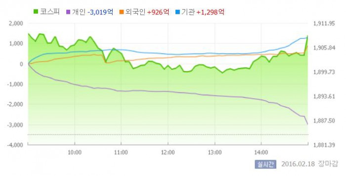 이날 코스피는 전일 대비 1.35% 상승한 1909.40에 장을 시작했다. 이후 지수는 등락을 거듭하며 결국 1900선에 안착했다. 코스피가 1900선을 회복한 것은 지난 5일 이후 6거래일 만이다.