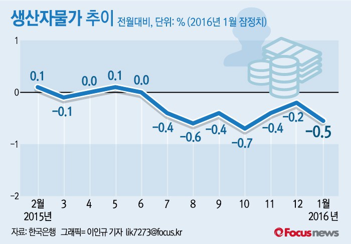 국내 물가 상황도 별반 다를바 없는 상황이다. 올해 1월 생산자물가지수가 5년 10개월 만에 최저치를 기록했다. 한국은행에 따르면 1월 생산자물가지수(2010년 100기준)는 98.52로 지난해 12월보다 0.5%, 전년 동월 대비 3.3% 하락했다. 이는 지난 2010년 3월 이후 5년 10개월 만에 가장 낮은 수준이다.(서울=포커스뉴스) 19일 한국은행에 따르면 지난달 생산자물가지수(2010년 100기준)는 98.52로 지난해 12월보다 0.5%, 전년 동월 대비 3.3% 하락했다. 2016.02.19 이인규 인턴기자