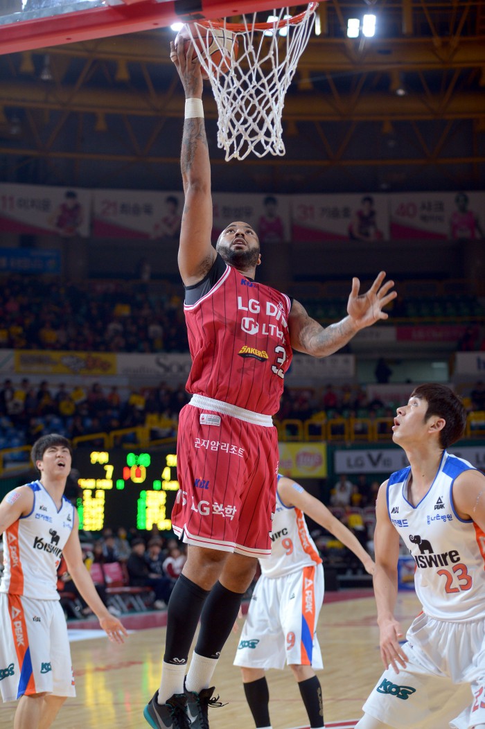 LG는 19일 경남 창원실내체육관에서 열린 전자랜드와의 경기에서 75-62로 이겼다. 연승을 달린 LG는 21승32패를 기록했다. 마지막 홈경기 승리로 홈승률 5할(14승13패)을 넘겼다. 전자랜드는 4연승이 중단되며 17승36패를 기록했다.