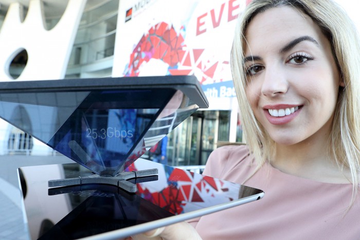 한편 KT는 이번 MWC 2016에 7개의 K챔프들이 글로벌 진출의 기회를 찾을 수 있도록 스타트업존을 별도로 구성하고, 글로벌 IT 기업 및 투자자들과의 미팅도 적극 지원한다. MWC 2016 참여 기업은 총 7개로, '울랄라랩'의 위콘(WICON)을 활용한 스마트 공장 솔루션, '12CM'의 스마트폰 전용 스탬프 및 인증 솔루션, '247'의 전기 충격기 기능의 호신용 스마트폰 케이스, '아마다스'의 IoT기반 스마트 레버락, '아토큐브'의 나무블록과 스마트폰을 연계한 스마트 토이, 'Alt-A'의 사각지대 지능형 교통 안전 시스템, '로보틱스'의 해수욕장을 위한 인명 안전 부표 등이 전시된다.모델이 KT가 세계최초로 시연한 25.3Gbps 속도를 홀로그램으로 보여주고 있는 모습. <사진제공=KT>