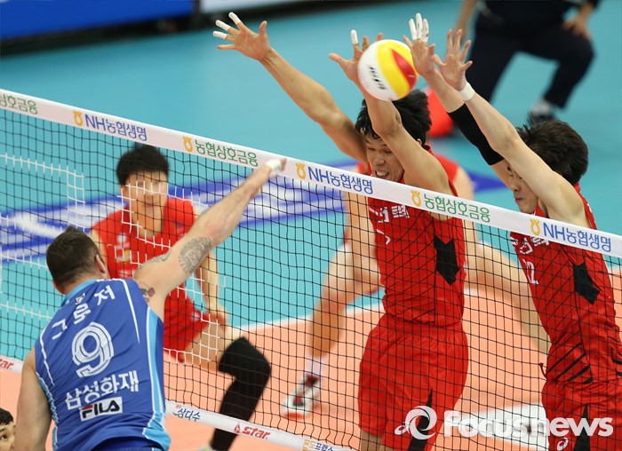 (수원=포커스뉴스) 23일 수원실내체육관에서 열린 '2015-2016NH농협 V-리그' 남자부 한국전력-삼성화재 경기에서 삼성화재 그로저가 한국전력 전진용, 전광인의 블로킹 사이를 뚫는 스파이크를 때리고 있다.