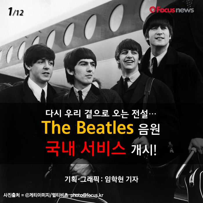 (서울=포커스뉴스) 오는 29일부터 록 밴드 '비틀스(The Beatles)'의 음원을 국내에서도 들을 수 있습니다. 총 17개의 비틀스 음반에 대한 다운로드 및 스트리밍 서비스를 국내 주요 온라인·모바일 음원 서비스 업체를 통해 이용할 수 있게 되는 것이죠. 지금까지 국내에 서비스 되지 않았던 이유는 무엇인지 그리고 비틀스의 명곡에는 어떤 것들이 있는 지 카드뉴스로 확인해 보았습니다.