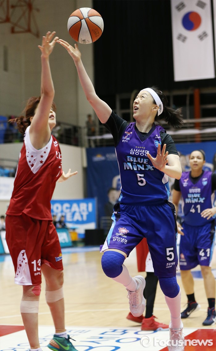 (구리=포커스뉴스) 24일 구리시체육관에서 열린 2015~2016 여자프로농구 KDB생명-삼성생명 경기에서 삼성생명 이미선이 KDB생명 김소담의 마크를 피해 레이업슛을 시도하고 있다.