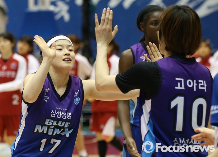 (구리=포커스뉴스) 24일 구리시체육관에서 열린 2015~2016 여자프로농구 KDB생명-삼성생명 경기에서 KDB생명을 물리치고 공동 3위에 오른후 삼성생명강계리와 고아라가 하이파이브를 하며 기뻐하고 있다.