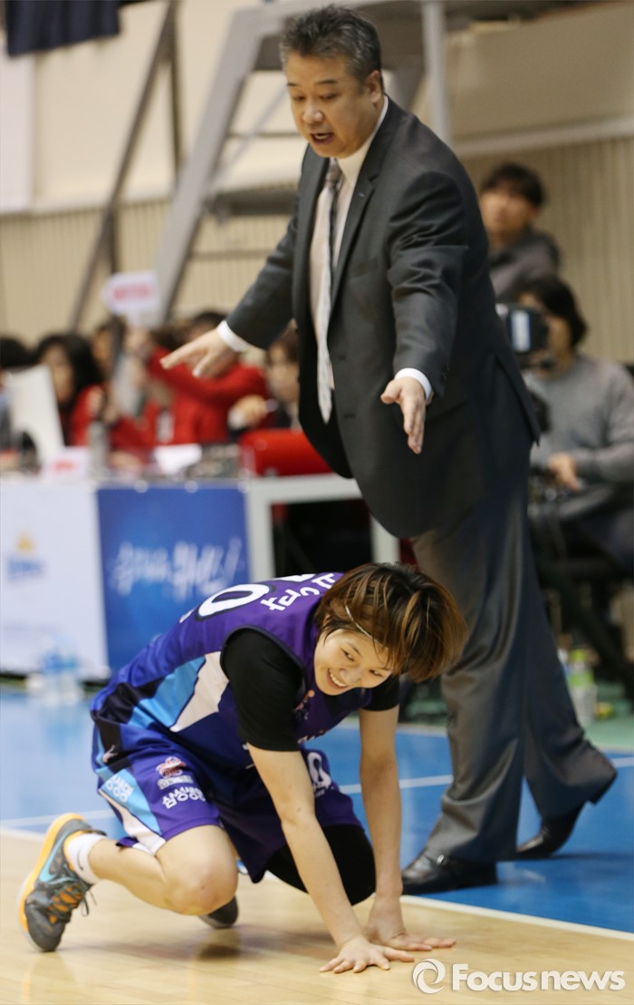 (구리=포커스뉴스) 24일 구리시체육관에서 열린 2015~2016 여자프로농구 KDB생명-삼성생명 경기에서 삼성생명 고아라가 이미선의 패스를 놓치고 넘어지자 임근배 감독이 일어나라며 독려하고 있다.