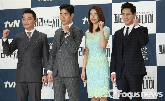 (서울=포커스뉴스) 25일 오후 서울 영등포구 타임스퀘어 아모리스홀에서 열린 tvN 월화드라마 '피리부는 사나이' 제작발표회에 참석한 배우 조재윤(왼쪽부터), 유준상, 조윤희, 신하균이 포토타임을 갖고 있다.