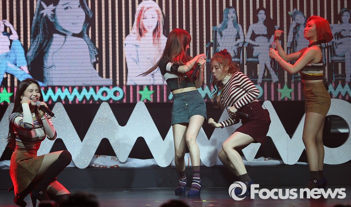 (서울=포커스뉴스) 25일 오후 서울 마포구 예스24 무브홀에서 열린 걸그룹 마마무의 정규 1집 'Melting' 쇼케이스에 참석한 멤버들이 신곡무대를 선보이고 있다. 왼쪽부터 멤버 솔라, 문별, 휘인, 화사