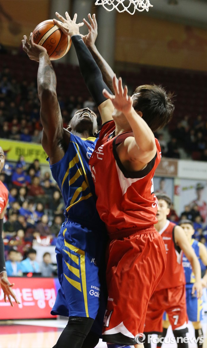 (안양=포커스뉴스) 25일 안양실내체육관에서 열린 2015-2016 프로농구 6강 플레이오프 KGC-삼성 1차전에서 KGC 오세근이 삼성 라틀리프의 슈팅을 블록으로 저지하고 있다.