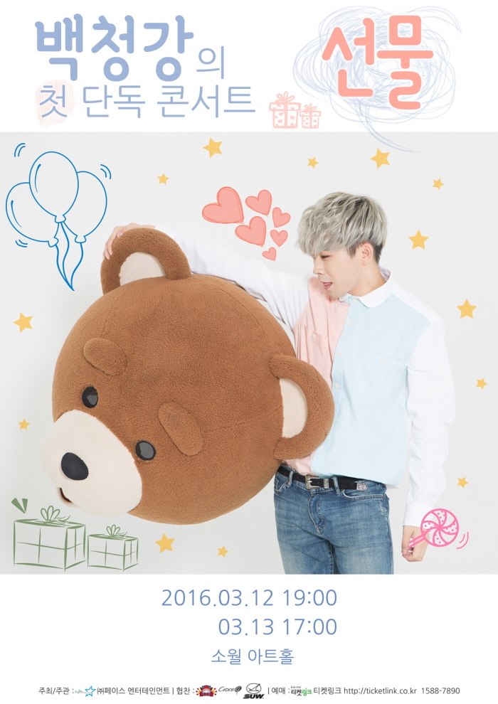 백청강의 첫 단독 콘서트 ‘선물’은 팬들의 사랑에 보답하고 싶다는 뜻에서 붙여진 제목이다. 이번 공연에서 백청강은 밴드와의 협연을 통해 MR로는 소화할 수 없는 멋진 무대를 준비 중이다.