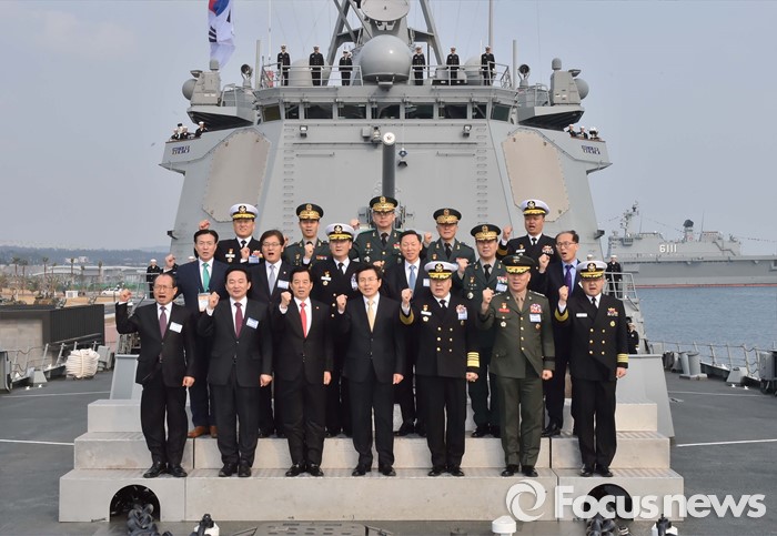 (서울=포커스뉴스) 황교안 국무총리가 26일 오후 제주 서귀포 제주해군기지에서 열린 제주민군복합형관광미항 준공식에 참석해 이지스구축함 서애류성룡함에서 기념촬영을 하고 있다. <사진제공=해군>