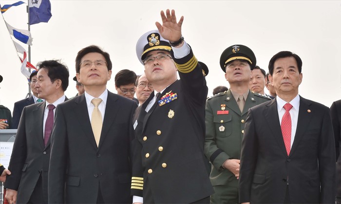 (서울=포커스뉴스) 황교안 국무총리가 26일 오후 제주 서귀포 제주해군기지에서 열린 제주민군복합형관광미항 준공식에 참석해 이지스구축함 서애류성룡함을 둘러보고 있다. <사진제공=해군>