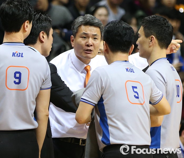 (고양=포커스뉴스) 26일 고양체육관에서 열린 2015-2016 프로농구 오리온-동부 6강 플레이오프 1차전에서 동부 김영만 감독이 전반 종료후 경기중 판정에 대해 심판들에게 강력한 항의를 하고 있다.